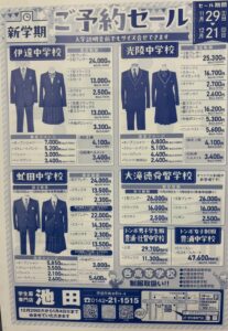 11月29日から 中学校制服の採寸開始になります。 伊達中学校、光陵中学校11月29日~12月21日までが卒業式対応採寸期間になります。 虻田中学校、大滝徳舜瞥学校、豊浦中学校等の学生服については、11月29日~1月6日 […]